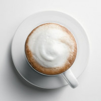 The image shows a cup of coffee with frothy foam on top, placed on a white plate. There are no people or additional objects visible in the picture. It appears to be a product photo, likely intended for advertising or showcasing the item.