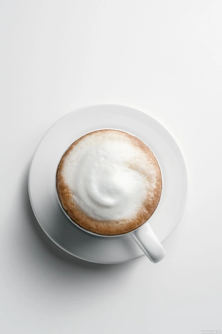 На картинке изображена чашка кофе с пенопластом сверху, помещенная на белую тарелку. На снимке нет людей или дополнительных объектов. Это фотография продукта, вероятно, предназначенная для рекламы или демонстрации товара.