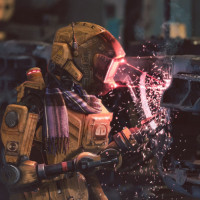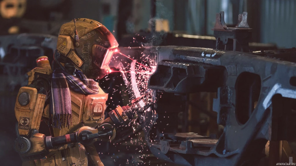 protective gear and seems to be working on a mechanical assembly, possibly welding or repairing it. The background suggests that this could be part of a workshop or