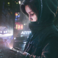 a young woman with dark hair, wearing a hooded garment. She is looking at something in her hands and appears to be focused on it. Her surroundings suggest