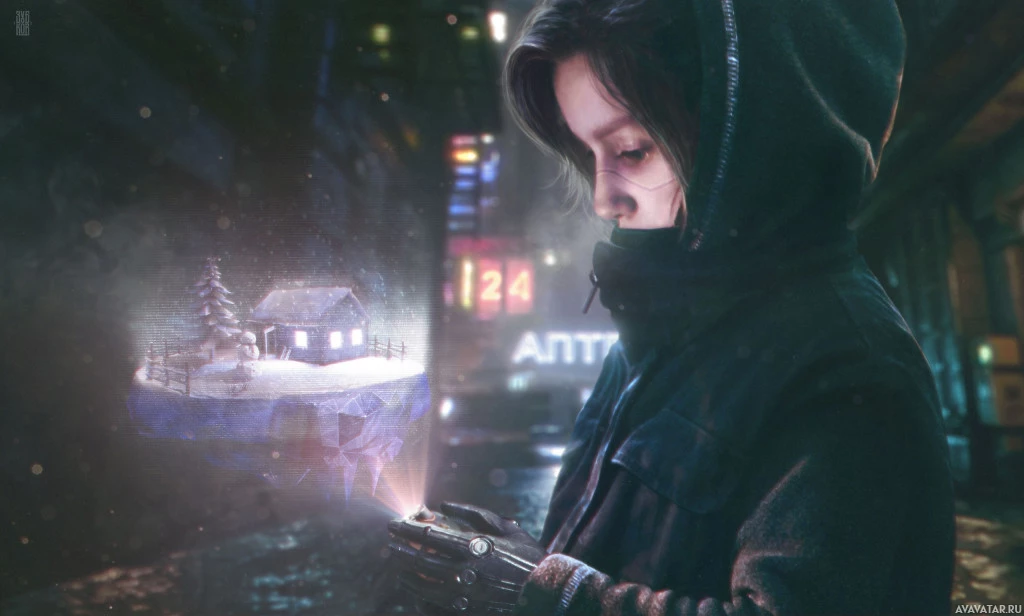 an urban environment, possibly during the evening or night, given the artificial lighting and the misty atmosphere. There's also a faint image of what looks like a house with a Christmas tree in the background, which adds a touch of whimsy to the otherwise
