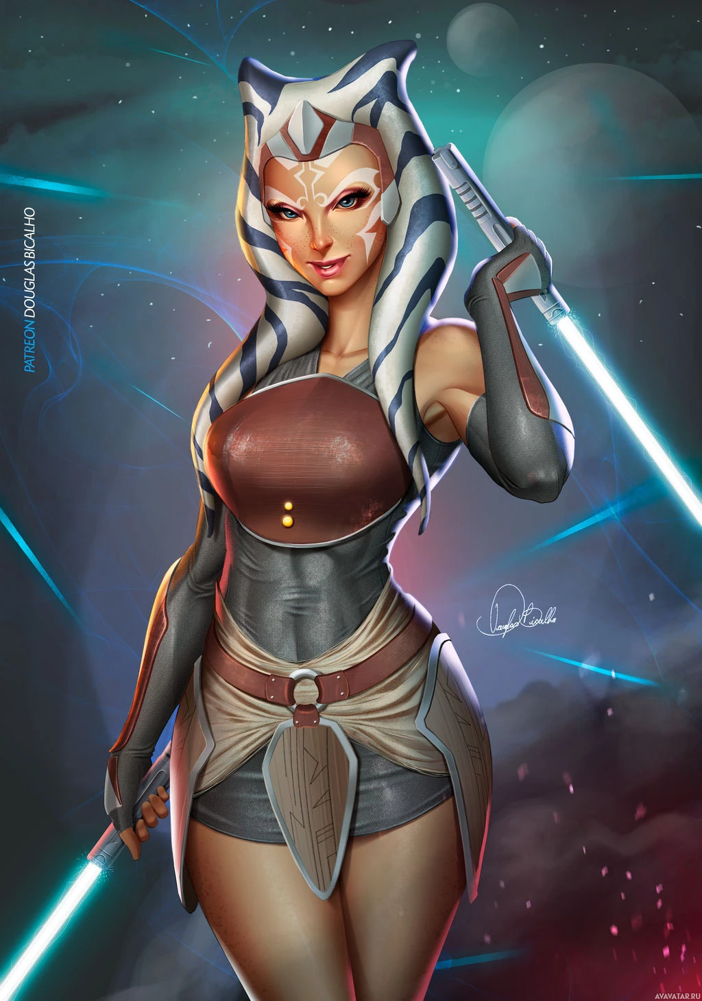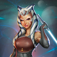 armor pieces, and holding a lightsaber. The background suggests a cosmic or interstellar setting, which is common in the Star