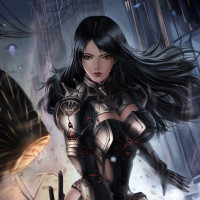 a female character with dark hair, wearing what appears to be armor or a suit of some sort. She is striking
