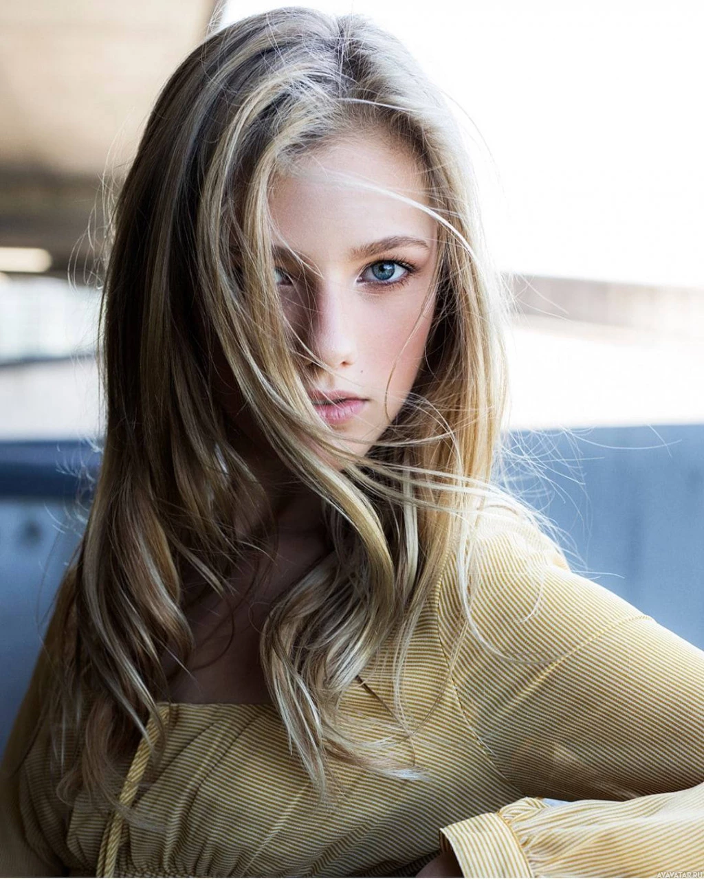 На фото изображена молодая женщина с длинными светлыми волосами. Она имеет нейтральное выражение лица и смотрит прямо в камеру. Ее стиль предполагает современное чувство моды, возможно, отражающее современные тенденции в женской одежде и прическах. Нет никаких отличительных ориентиров или отличительных признаков, которые обеспечивали бы дополнительный контекст о местоположении или настройке фотографии.