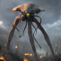 a science fiction scene featuring a large, menacing creature that resembles an octopus or squid-like being. This creature is attacking what appears to be