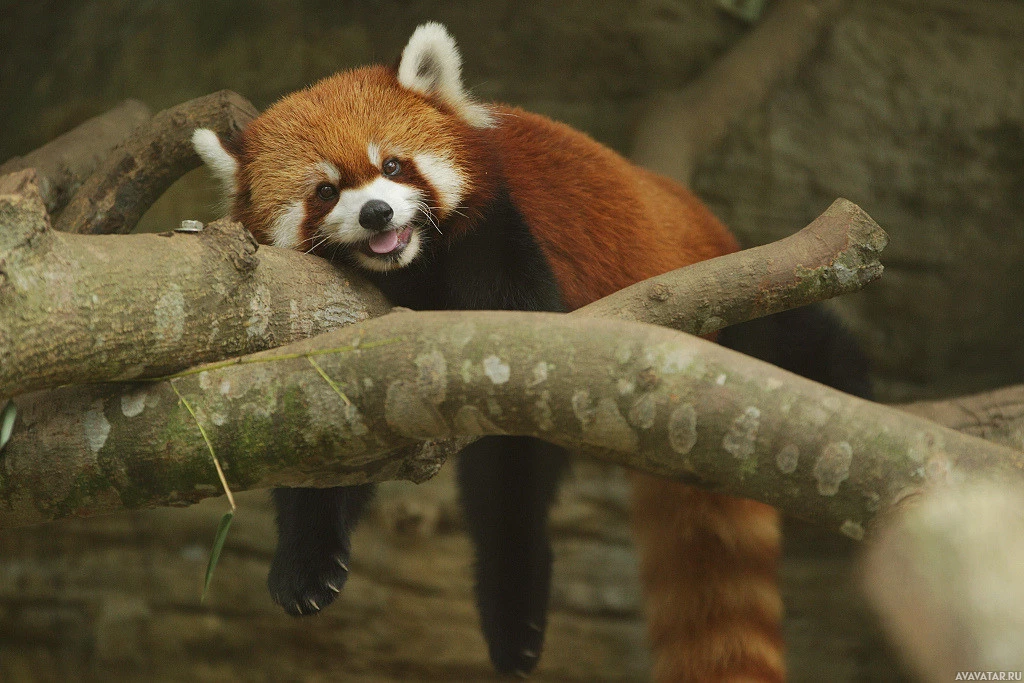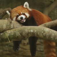 a red panda, which is an arboreal mammal native to eastern Himalayas and southwestern China. It has reddish-orange fur with white facial markings and