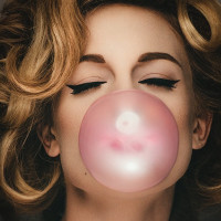 closed eyes, blowing a large bubble of gum. Her makeup is elaborate and contributes to