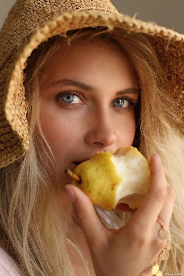 blonde hair and is wearing what looks like a sun hat or perhaps a straw hat, which suggests a warm, possibly sunny environment. She is eating a pear while looking directly at the camera with