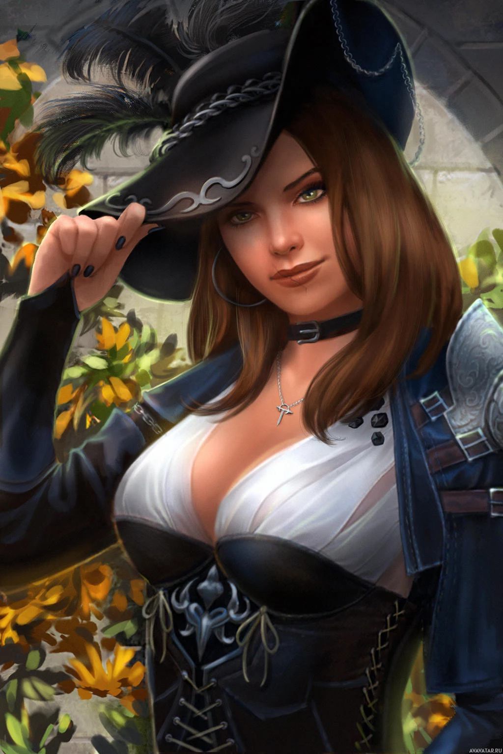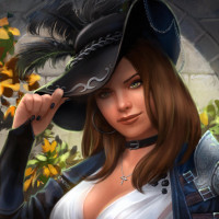 adventure setting, as suggested by her attire and the backdrop featuring flowers. The overall style of the image suggests it could be from