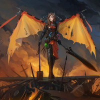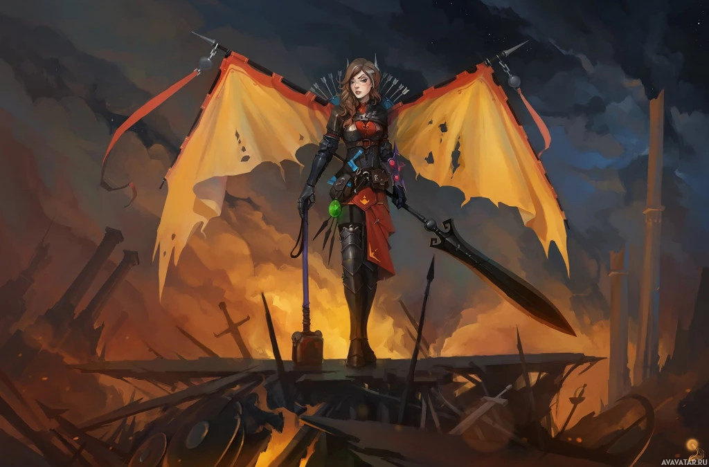 a female character with wings, resembling an angel or supernatural being. She is standing amidst what appears to be