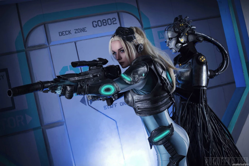 The image depicts two individuals dressed in costumes that are associated with the character of Samus Aran from the "Metroid"