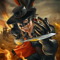 a black hat adorned with red feathers that are characteristic of the Zorro persona. The background suggests a dramatic, possibly action-packed setting, hinting at