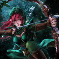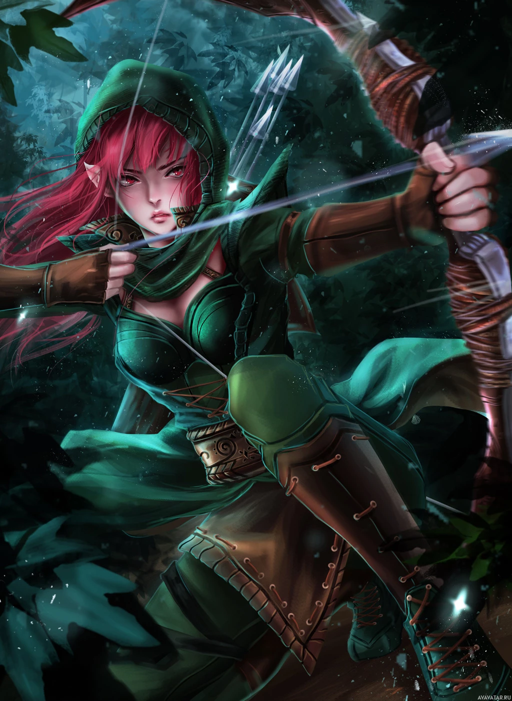 red hair and is wearing archery gear, including a hood, which suggests a rogue or ranger archetype. The setting looks like