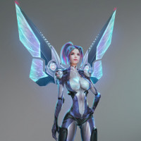 The image shows a 3D rendering of a female character dressed in futuristic armor with a winged design. She has blue and purple accents on her attire, suggesting she might be a part of science fiction narrative. The background is neutral to keep the focus on her.