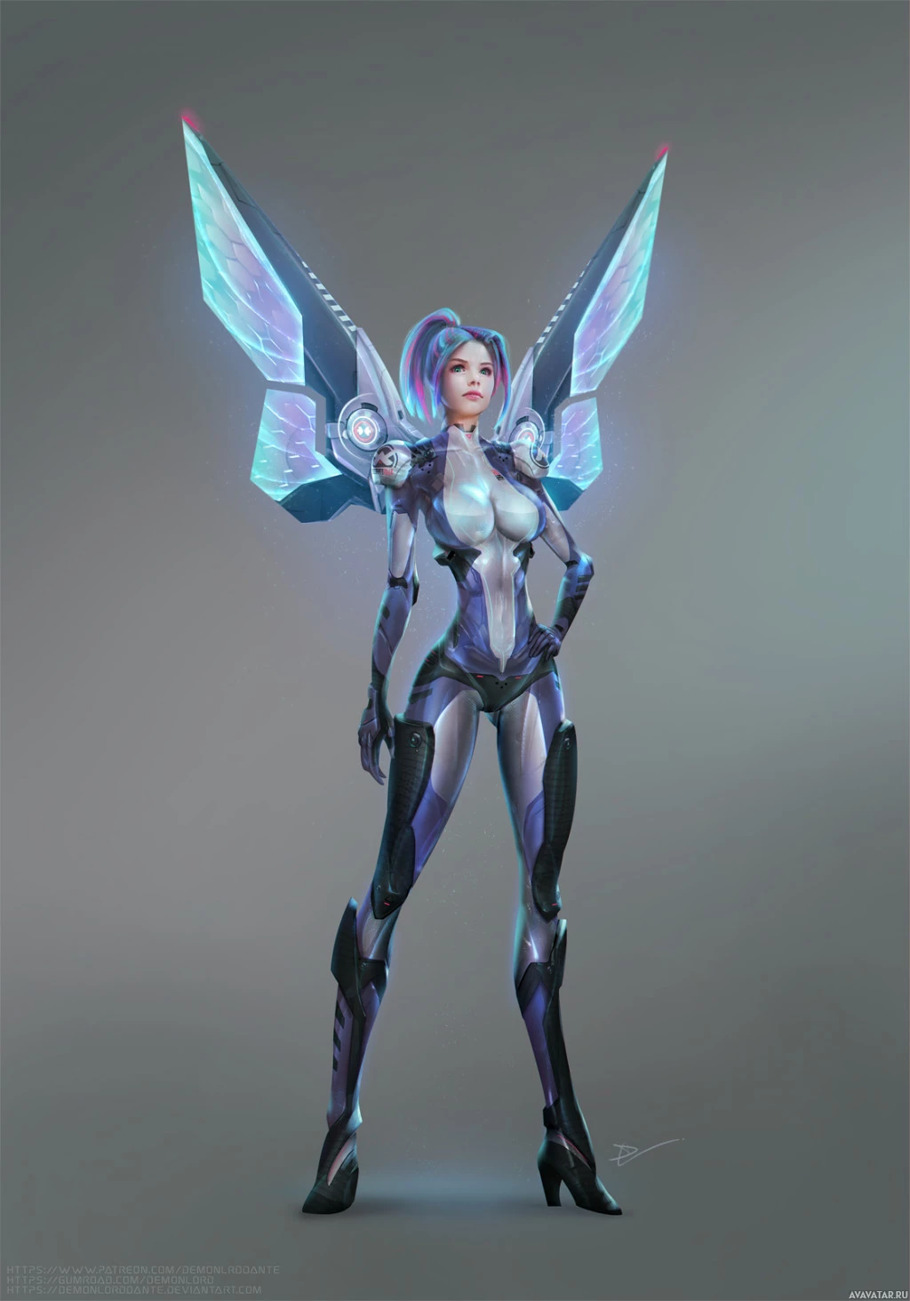 Картинка показывает 3D-рендеринг женского персонажа, одетого в футуристическую броню с крылатым дизайном. У нее синий и фиолетовый акценты на одежде, предполагая, что она может быть частью научной фантастики. Фон нейтральный, чтобы сосредоточиться на ней.