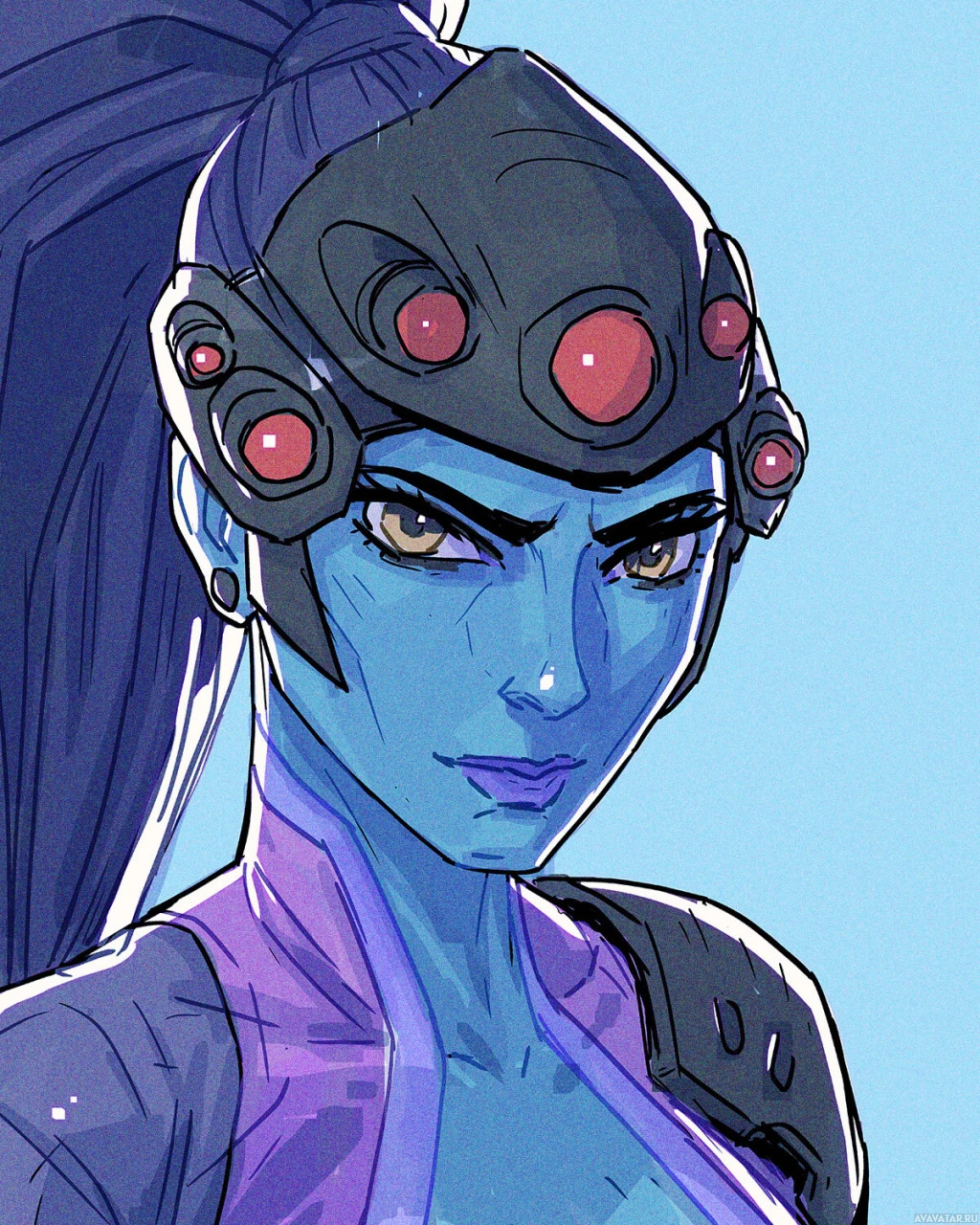 Это иллюстрация персонажа из видеоигры «Overwatch». Изображенный персонаж - Вдоводел, известный своими навыками со снайперскими винтовками и ее культовым фиолетовым и черным костюмом.