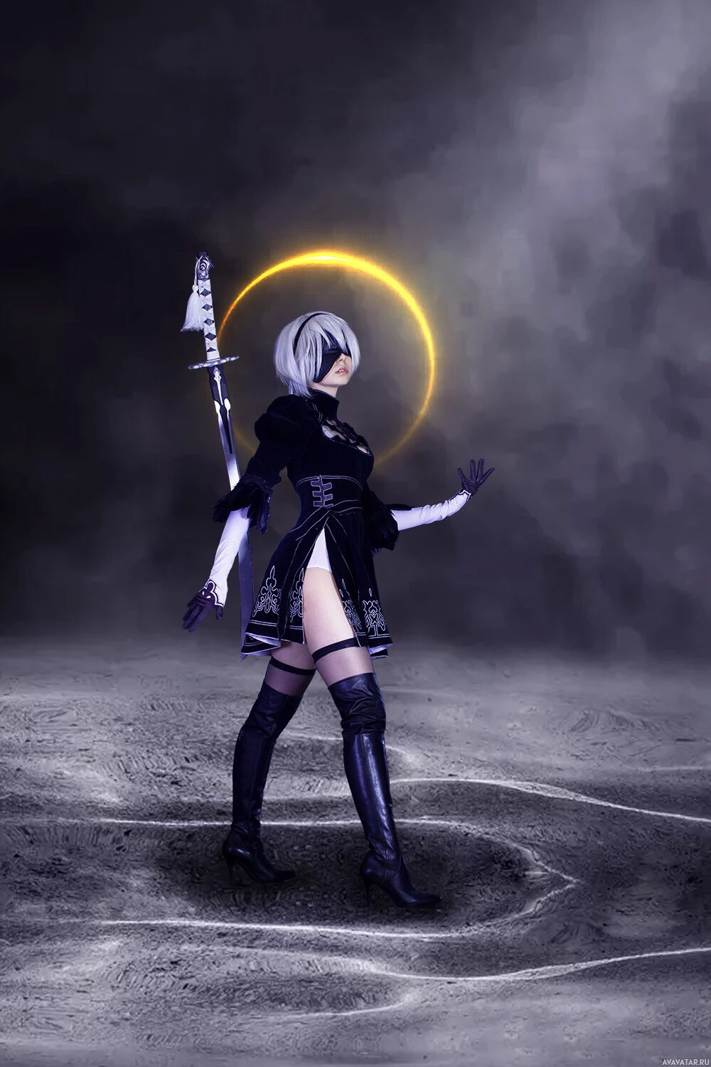 the video game "Nier: Automata." This is a cosplay of the protagonist, YoRHa No.2 Type A (2B), portrayed in her