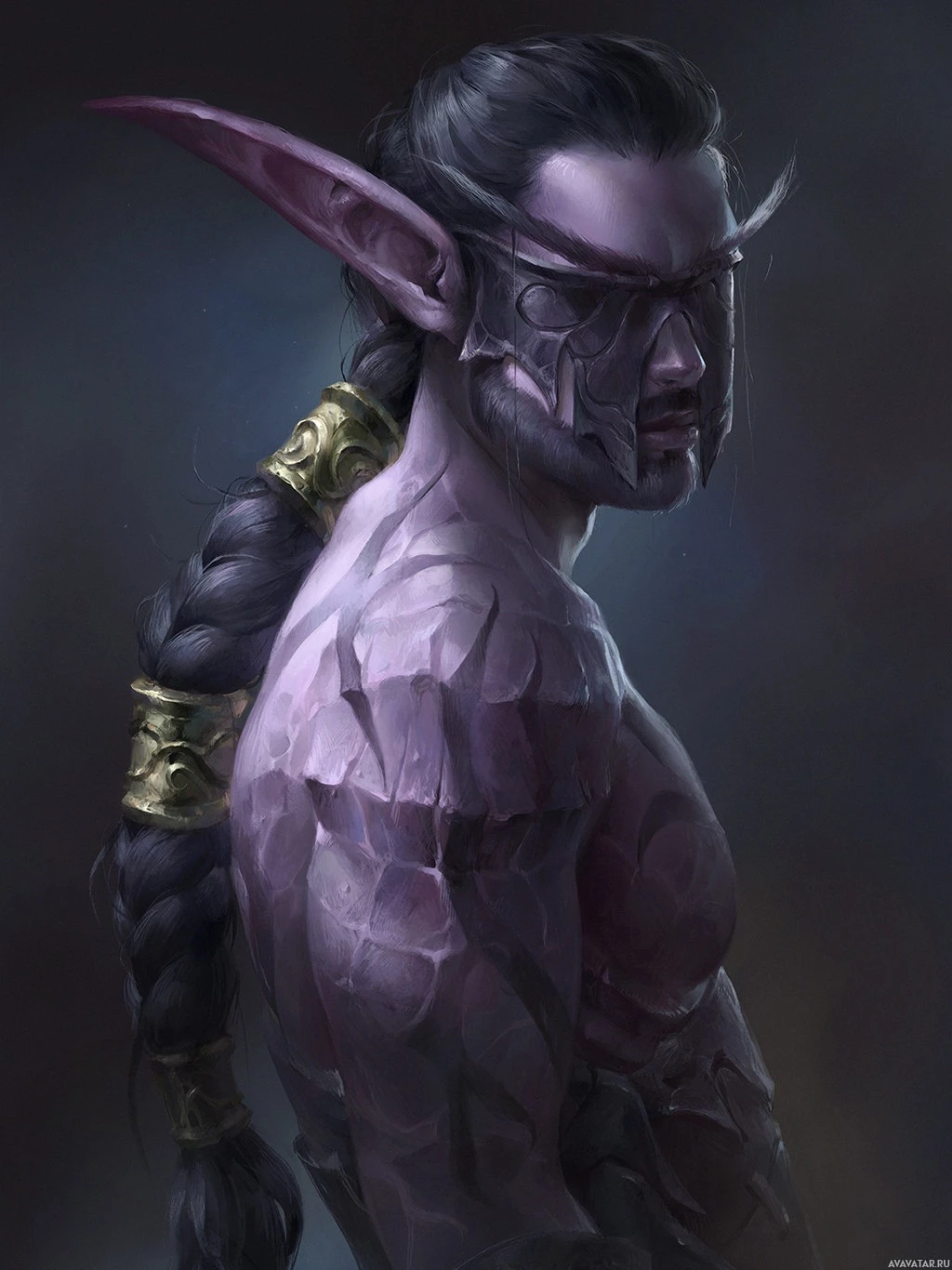 pointed ears and purple skin, typical of the drow in Warcraft lore. The style of the illustration suggests it could be a piece of