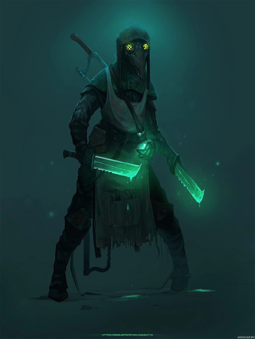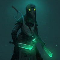a hooded cloak with a mask obscuring the face, giving them an air of mystery or anonymity. In their left hand, they are holding what appears to be a potion or flask, which glows green, possibly indicating some sort of magical or enchanted property. In their right hand, they wield a sword with a yellowish glow around it, suggesting the sword might also possess