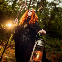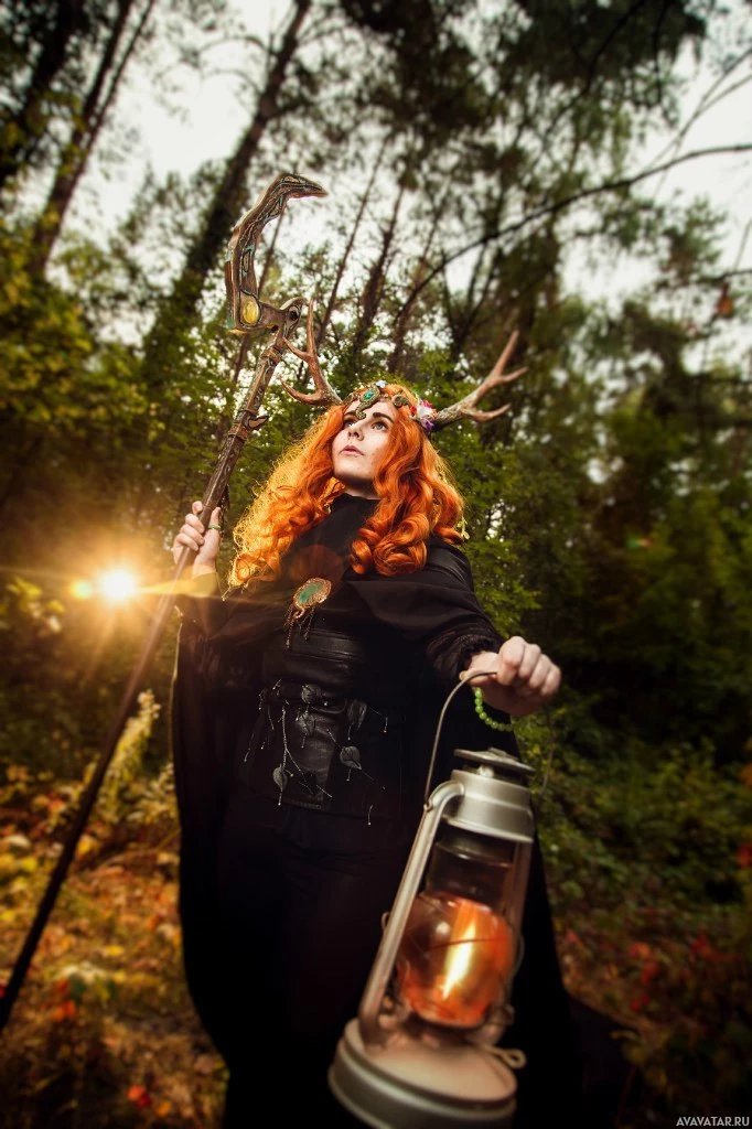 red hair, is wearing a dark outfit with intricate details and embellishments, and is holding what seems to be a lantern in one hand. They also have accessories such as a staff and a headdress that could suggest