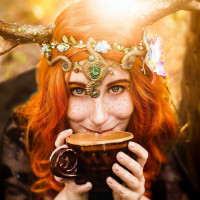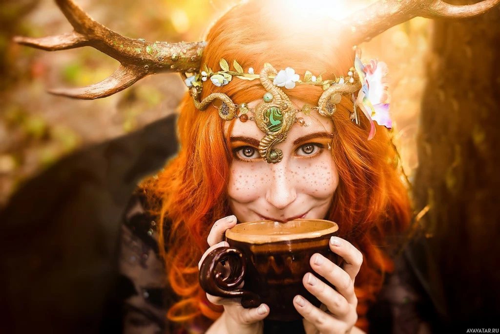 a young woman with red hair, adorned with a headpiece that appears to be made of deer antlers or an accessory with a similar design. She is holding a cup and seems to be in