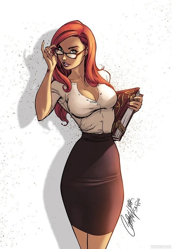 red hair, wearing glasses and a business-style outfit consisting of a skirt and blouse. She appears to be holding or looking at a book. The style is reminiscent of