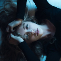 The image shows a woman lying down on a bed, looking directly at the camera. Her head is resting on one hand, and she seems to be gazing intently towards something not visible in the picture. She has her hair loose and appears to have a neutral or slightly pensive expression.