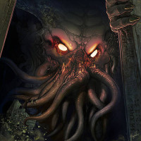 a fantasy scene featuring a character that resembles Cthulhu, which is commonly associated with the Lovecraftian mythos. The creature has tentacles and an aggressive expression on its face, and it appears to be emerging from a darkened environment, possibly a cave or