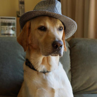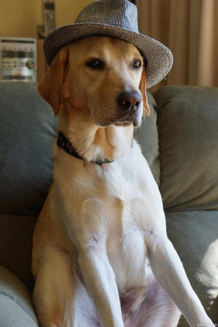 На картинке изображен лабрадор-ретривер, сидящий на диване. Собака носит шляпу, придавая ей несколько человекоподобный вид. Кажется, что он смотрит прямо в камеру с внимательным выражением.