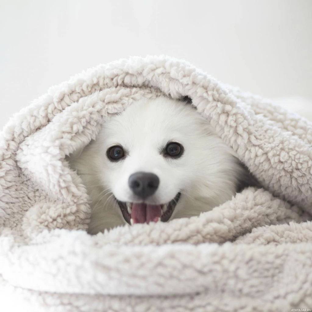 a soft blanket, which suggests a warm and cozy environment, possibly during winter or indoors for comfort. The dog's eyes are wide open and looking directly at the camera, giving