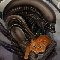 an alien creature from the "Aliens" movie, and a cat lying comfortably in the alien's lap. This creates a humorous and unexpected juxtaposition of a known