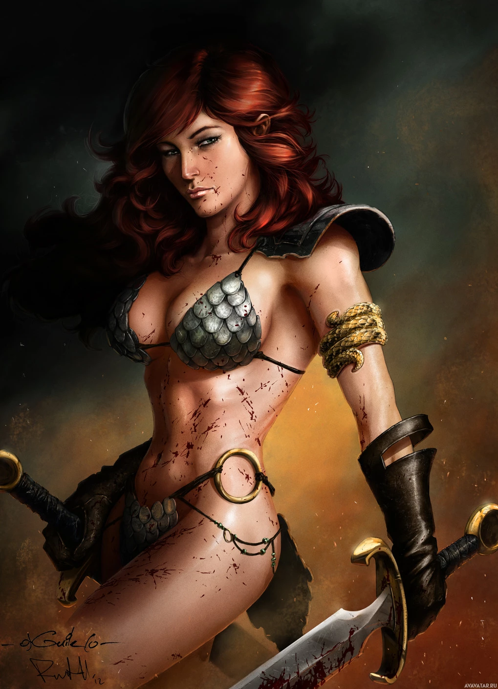 На картинке изображена женщина с рыжими волосами, в доспехах и с мечом. Это скорее иллюстрация, чем фотография реального человека. Стиль напоминает фэнтезийное произведение искусства, предполагая, что персонаж может быть из мифической или фэнтезийной обстановки.