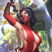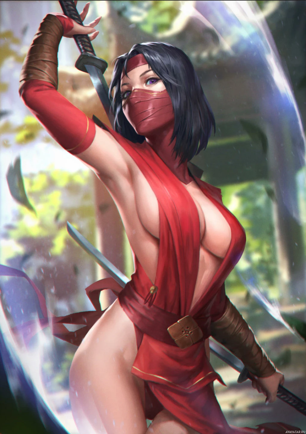 a female figure with brunette hair, dressed in a red outfit that resembles traditional Asian warrior attire, complete with what appears to be armor and a mask covering her eyes. The character is holding a sword and has one hand on her hip, suggesting she may be in