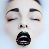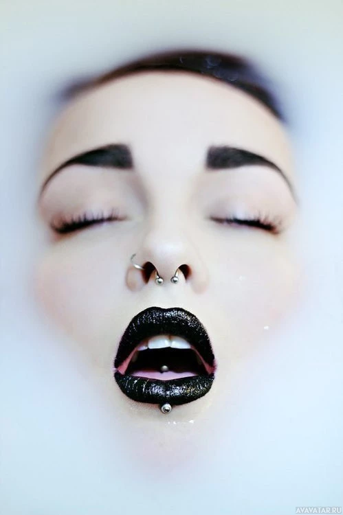 The image features a woman with her eyes closed, appearing to be submerged in water up to her chin. She has black lipstick and