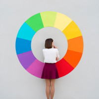 color wheel that is displayed on the wall. The colors of the wheel include green, yellow, orange, red, purple, blue, and gray, arranged in a rainbow-like pattern. The individual appears to be a woman with