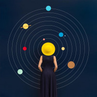 the solar system with planets (including Earth) arranged along an elliptical orbit around the sun. This image is likely intended to represent the concept of our solar system and its relationship through gravity.