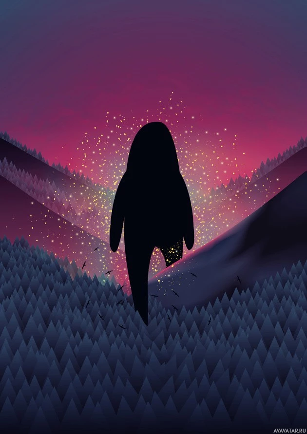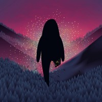 a silhouette of a person walking towards what appears to be a mountain or hill. There is a glowing effect, possibly from the sun or