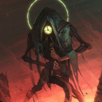 mythical creatures like demons or gods from ancient folklore or other fictional stories. It is set against a tumultuous sky with swirling clouds and what appears to be an impending storm or apocalypse, further enhancing the dark and