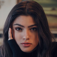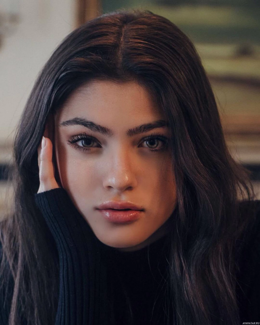 На картинке изображена молодая женщина с чёрными волосами, выглядящая задумчивой или слегка скучающей. Она держит руку на щеке и носит темный верх. Ее выражение кажется вдумчивым или усталым.