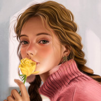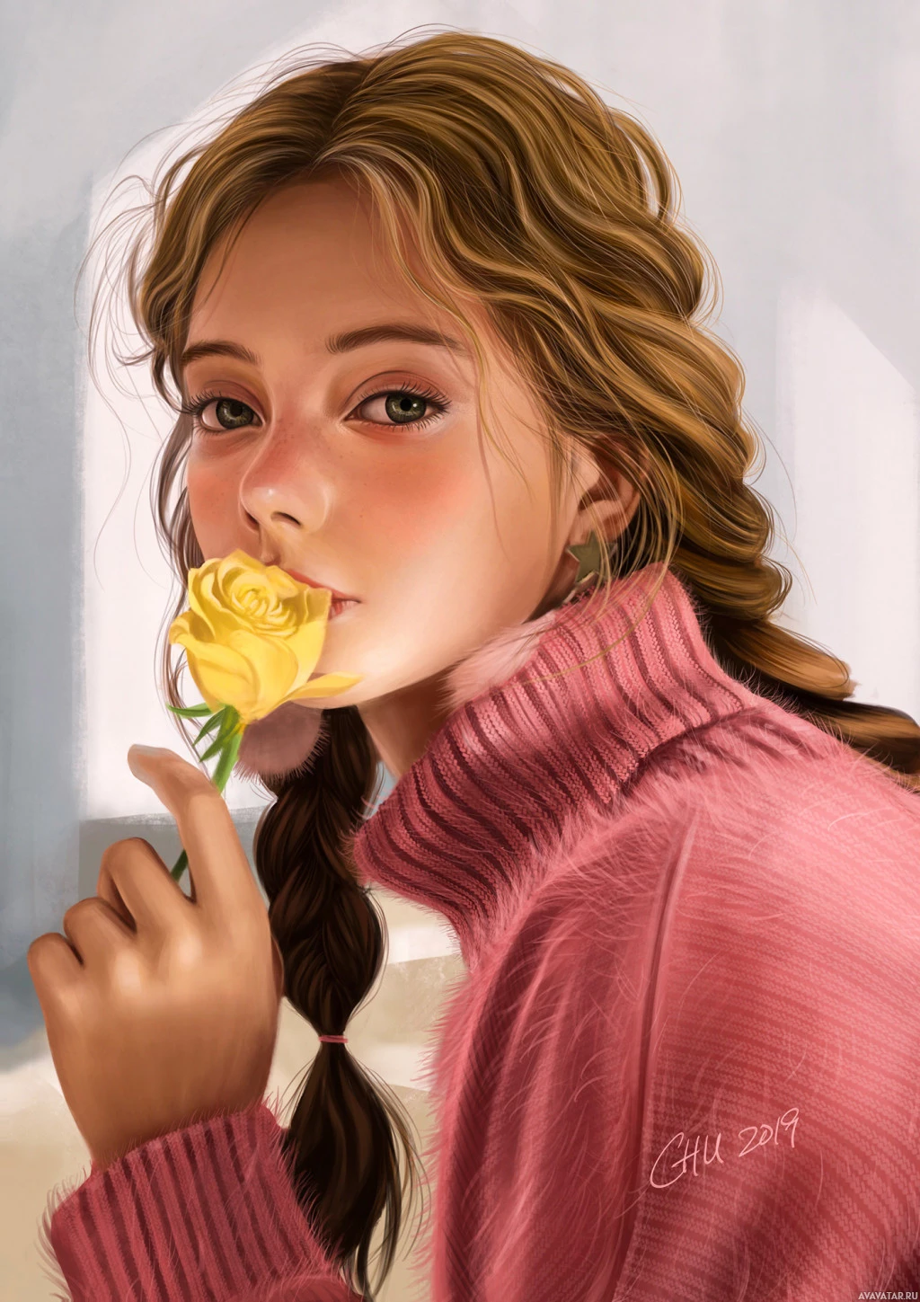 На картинке изображена молодая женщина со светлыми волосами. Она, кажется, держит розу близко к лицу, возможно, нюхая ее или собираясь положить ее в рот. Она носит розовый свитер и ее волосы стилизованы в косы. Фон изображения нечеткий, но кажется внутренним пространством с окном, которое позволяет естественному свету освещать сцену.