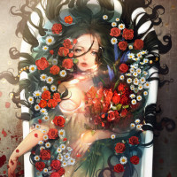 a small bouquet in their hands, which might be symbolic of the beauty within or the character's connection with the floral elements around them. The art style suggests it could be from a fantasy or