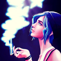 the video game "The Last of Us," known for her role as Ellie. She is holding a lighter, and there's a cigarette in her hand with smoke emanating from it. The background suggests she might be in a smoky or damp environment, possibly indicating a scene from the game where the characters are in such an environment.