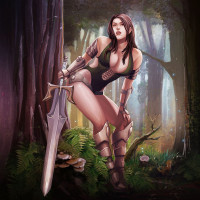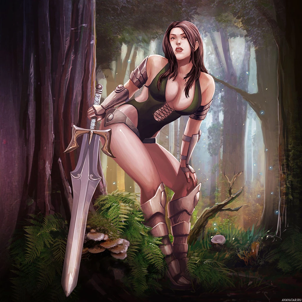 fitting armor that appears to be designed for combat or exploration. Her left hand is resting on her hip while her right hand holds a sword with a pointed tip and