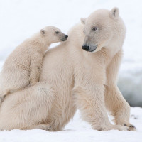 The image shows two polar bears. One is an adult and the other appears to be a younger bear, possibly a cub or juvenile. They are in an Arctic environment with visible snow and ice. The adult bear seems to be standing while the younger one is sitting. It's a snapshot of their life in the wild.