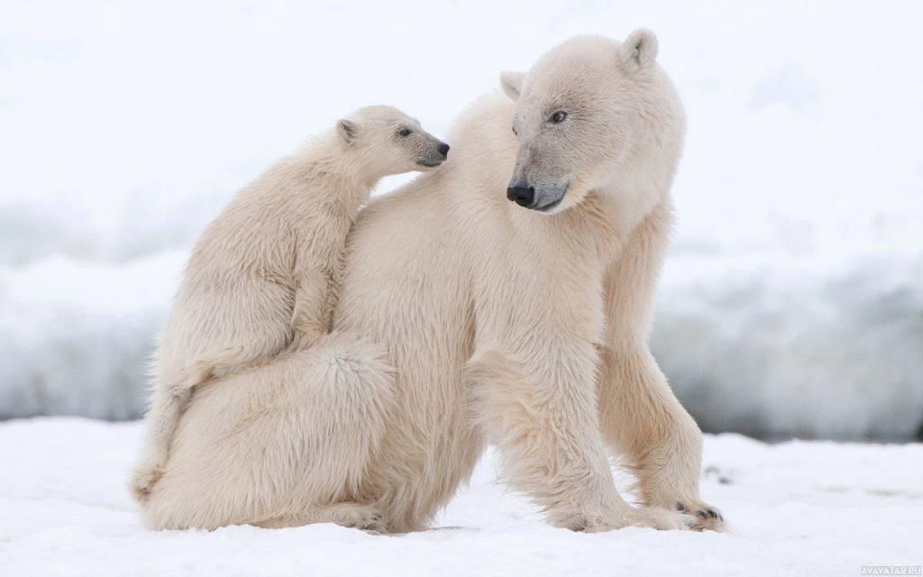 На картинке изображены два белых медведя. Один из них взрослый, а другой, по-видимому, младший медведь, возможно, детеныш или подросток. Они находятся в арктической среде с видимым снегом и льдом. Взрослый медведь, кажется, стоит, а младший сидит. Это снимок их жизни в дикой природе.