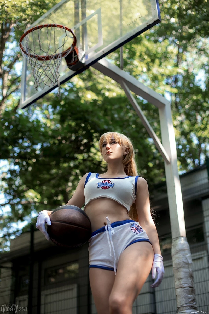 The image shows a person dressed in a basketball-themed cosplay, holding a basketball. They are standing on what appears to be a court, with the hoop visible behind them. The setting suggests
