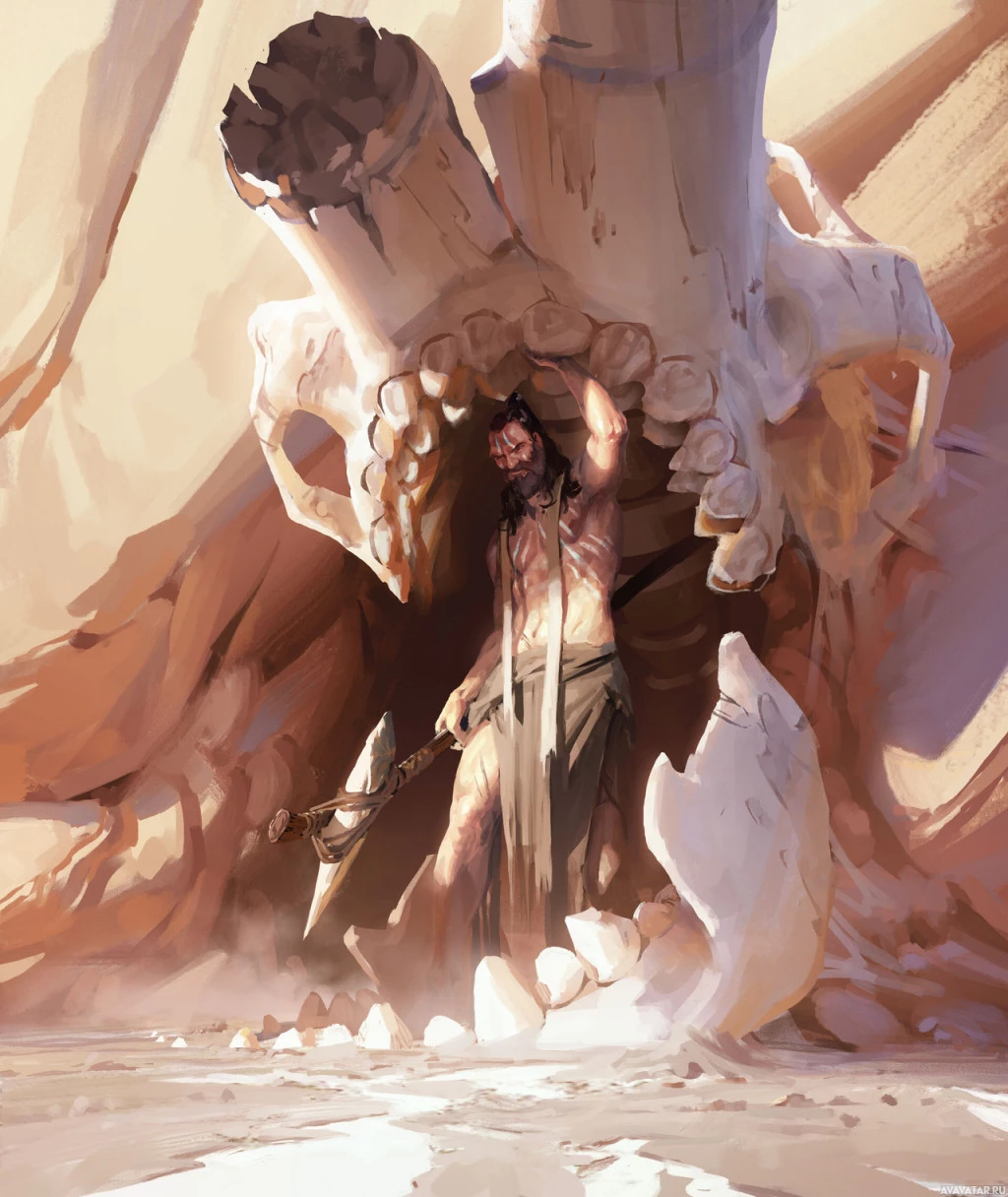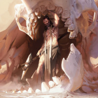 The image depicts a character who appears to be an adventurer or explorer. He is emerging from what looks like a prehistoric cave, holding onto the skull of