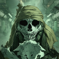 a skull for a face, holding what appears to be a human bone. The character is wearing