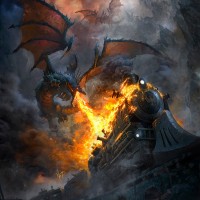a fantastical scene where a dragon is attacking a steam-powered train. The train, which has