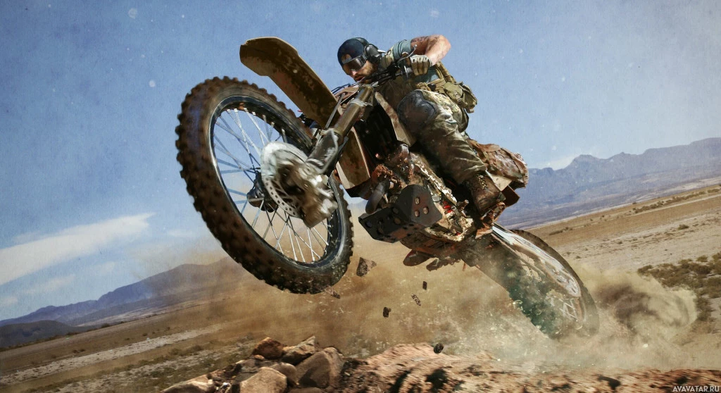 На картинке изображен человек, едущий на грязном велосипеде, выполняющий рулевое колесо. Они носят шлем и, кажется, ориентируются по пустынной местности с скалистыми скалами на заднем плане. Это боевик, запечатлевший волнение езды на мотоцикле по бездорожью.